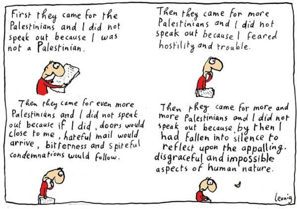Comparing Israel to Nazi Germany is sick enough, but using Pastor Martin Niemoller’s famous statement is even more warped. Is it any wonder that the Australian Jewish community is fed up with this Michael Leunig cartoon published in The Age of Melbourne?