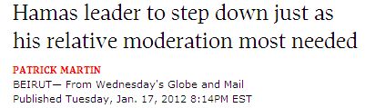 But when it was reported in February that Meshaal considered stepping down as the Hamas politburo chief, the Globe & Mail‘s Patrick Martin painted him as a pragmatic individual whose moderation was needed more than ever.