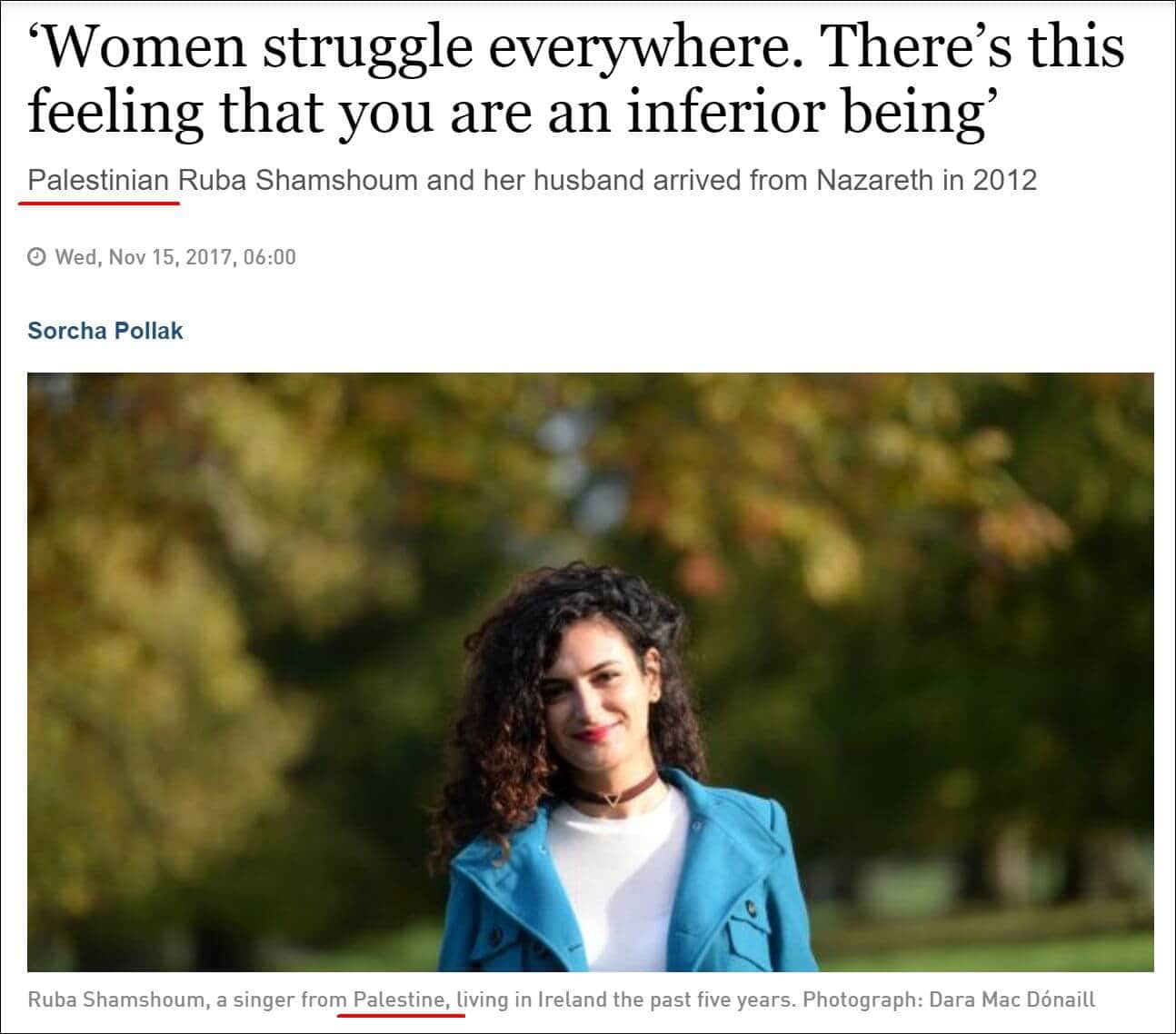 It is Shamshoun’s right to self-define any way she wishes and she may very well refer to herself as a Palestinian. However, by using this reference in the headline’s sub-header and failing to mention in the story that Shamshoun is an Israeli citizen, the Irish Times adds to the distorted view of Israel that it so often promotes.