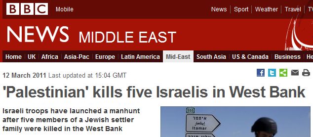 Even when the BBC does cover the murders, the visual emphasis remains firmly fixed on the location of the event on a West Bank settlement and the portrayal of Israel in militaristic terms.