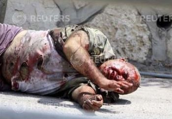 A Lebanese soldier wounded by an Israeli tank, lies on a street at Adaisseh village, southern Lebanon August 3, 2010. An Israeli helicopter on Tuesday fired two missiles at a Lebanese army post near the southern border village of Adaisseh, destroying an armoured personnel carrier, a security source said. A Lebanese journalist and three Lebanese soldiers died after the Israeli and Lebanese armies exchanged fire in the border area, a security source said. Reuters/Ali Hashisho