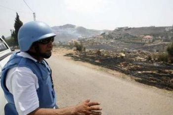 >An U.N. peacekeeper waves a United Nations Interim Force in Lebanon (UNIFIL) flag at Israeli soldiers on the Lebanese-Israeli border at Adaisseh village,southern Lebanon August 3, 2010. An Israeli helicopter on Tuesday fired two missiles at a Lebanese army post near the southern border village of Adaisseh, destroying an armoured personnel carrier, a security source said. A Lebanese journalist and three Lebanese soldiers died after the Israeli and Lebanese armies exchanged fire in the border area, a security source said. REUTERS/STR