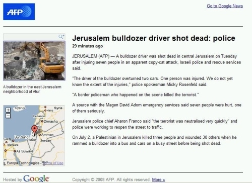 Although the AFP changed its headline to Palestinian Shot Dead After New Bulldozer Rampage, its first story on the incident was headlined, Jerusalem Bulldozer Driver Shot Dead: Police. The headline leaves out any information about victims or a rampage, leaving the casual reader scanning headlines to believe that a construction worker had been killed without cause.