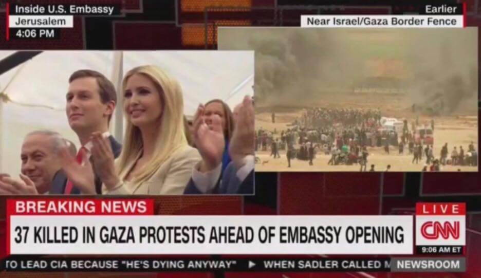 It wasn’t only about piggybacking on the coverage of the official ceremony marking the move of the US Embassy to Jerusalem. Live reports featured split screens simultaneously showing Americans and Israelis celebrating along with scenes of violence from Gaza.