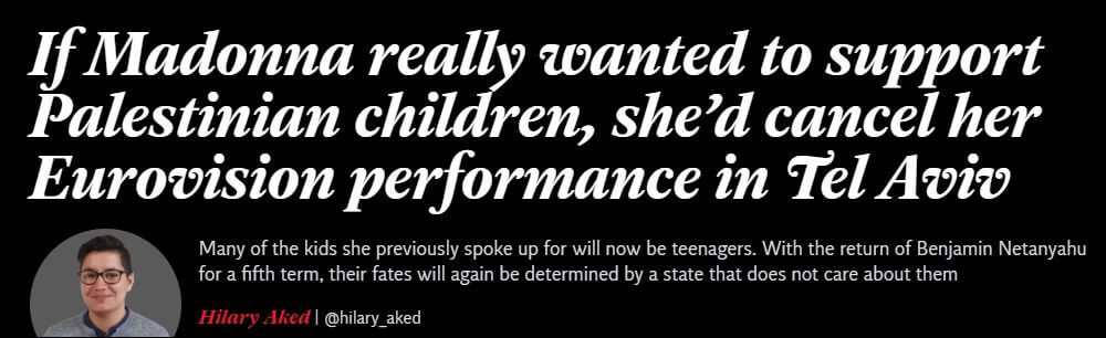 In the context of the current conversation about the location of the Eurovision finals and the participation of Madonna and the other performers, the brothers and sisters in question are the people of Palestine who live under a deeply repressive apartheid regime of occupation and do not enjoy the right to life, liberty and self-determination.