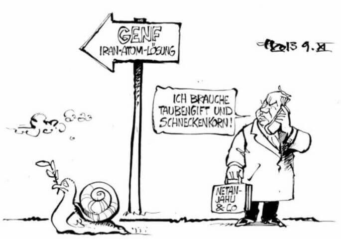 Horst Haitzinger’s cartoon was published in Badische Zeitung on the anniversary of Kristallnacht. It features a snail with a dove’s head on the way to Iranian nuclear talks in Geneva. Looking on is Benjamin Netanyahu, who says into a cell phone, “I need pigeon and snail poisons.”