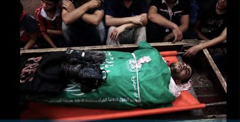 Another death CPJ includes in the report is that of Khaled Reyadh Hamad, a member of Hamas’ Izz al-Din al-Qassam Brigades, a terrorist operative who also apparently moonlighted as a cameraman in the terror group’s media network. Following his death in 2014, he was wrapped in the distinctive green flag of Izz al-Din al-Qassam Brigades (below) and was referred to as a “jihad fighter.”
