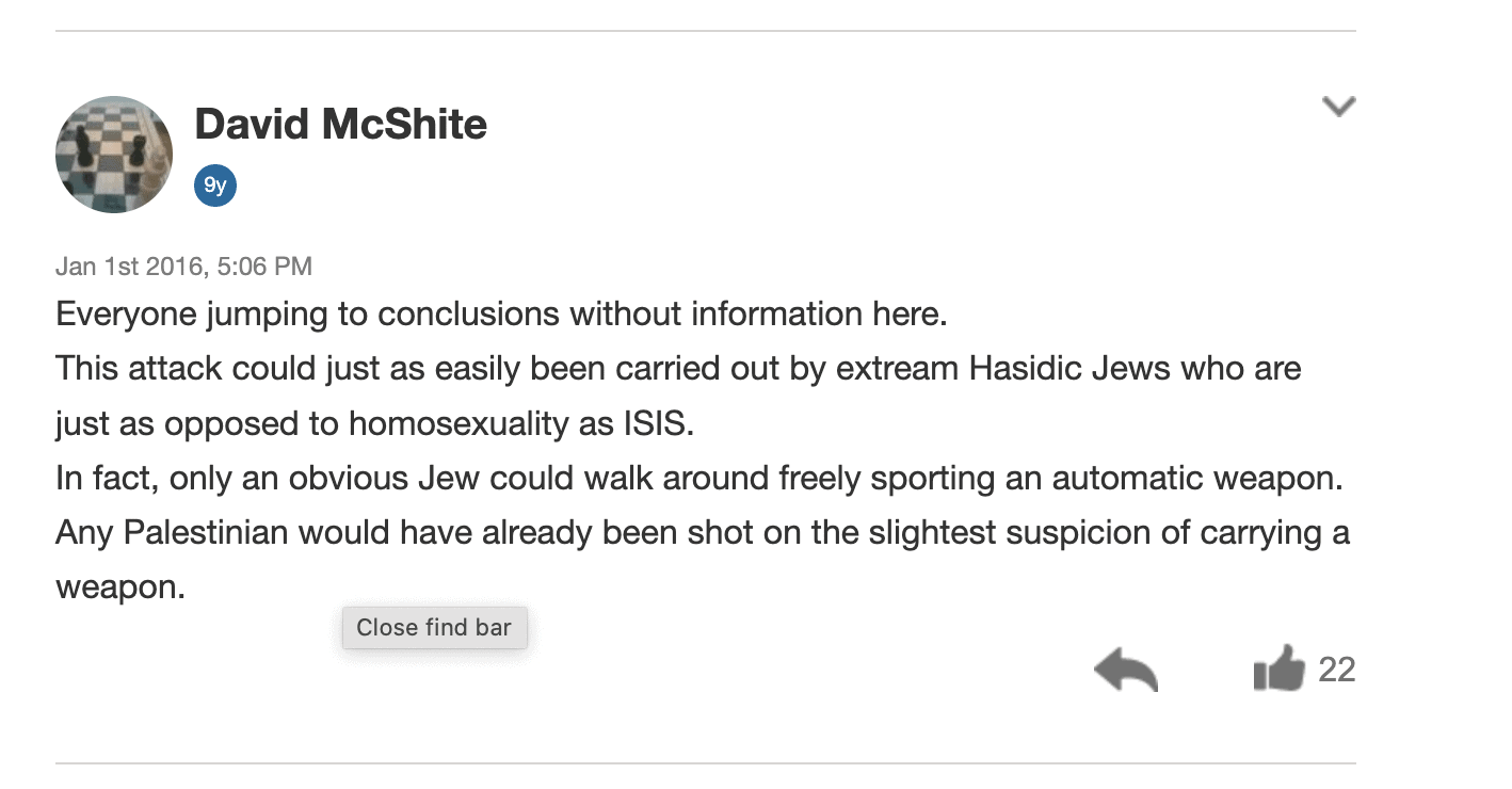 Another comment on a piece about a terror attack on innocent Israeli civilians disputed the labeling of Palestinian terrorists as “militants,” justifying the atrocity on the grounds that Palestinian assailants are “resistance fighters” because Israel has “no right to be in the West Bank.”