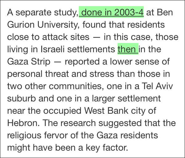 An otherwise good story in the New York Times, “To France From Israel: Lessons on Living With Terror,” included the following in reference to studies of Israeli behavior in the face of terror threats: