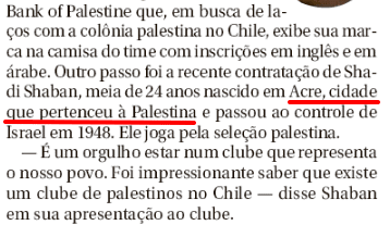 O Globo ESPORTES veiculou uma matéria sobre o time Palestino, do Chile, explicando, entre outras coisas, os esforços do time para se aproximar do “país” (Palestina):
