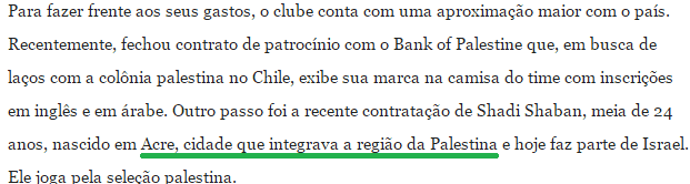 OBS: O jogador Shadi Shaban nasceu em Acre em 1992, faz parte da população árabe-israelense de Israel e competiu pelos times israelenses Maccabi Haifa, Hapoel Nir Ramat HaSharon, Hapoel Bnei Lod e Hapoel Acre antes de entrar no Palestino do Chile. Mas isso não consta na reportagem.