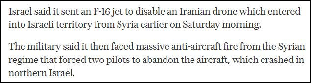 The Daily Telegraph‘s initial story on the Israeli interception of an Iranian drone and the subsequent downing of an Israeli F-16 made a real mess of the facts and the timeline.