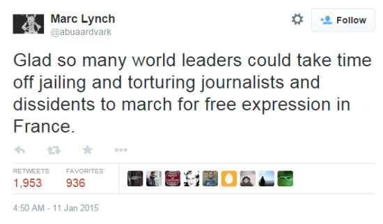 • It’s rather hypocritical of the Turkish, Egyptian, and Russian governments to march for press freedom in Paris while harshly cracking down on the same thing at home, n’est-ce pas? Professor Marc Lynch summed up my headspace.