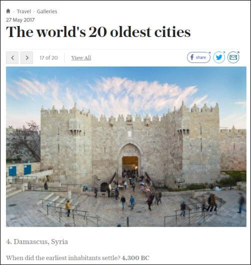 • Copy editors at the Daily Telegraph were asleep at the wheel this weekend. A slideshow of the world’s 20 oldest cities rightly included Damascus, but wrongly illustrated it with a photo of Jerusalem’s Damascus Gate. The Telegraph’s list also included Jerusalem and Jericho.
