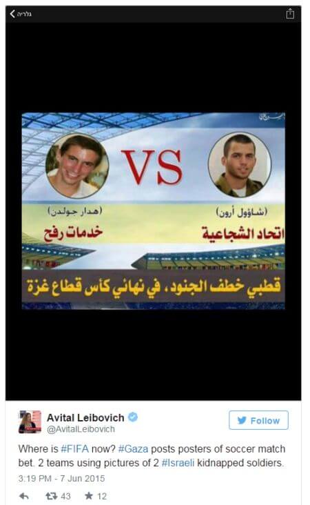 Photographs of Lt. Hadar Goldin and Staff Sgt. Oron Shaul, both of whose remains are believed to be in Hamas hands, were printed on ads for a game between Khadamat Rafah and Itehad Shujaiyya, the cities where they were killed. The writing alongside the soldiers’ pictures reads: “The two teams of kidnapping soldiers compete in the Gaza Cup final.”