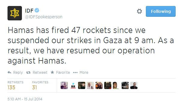 1. Hamas rejected an Egyptian ceasefire initiative which Israel accepted this morning. A break in IDF air strikes to give peace a chance was met with continued Palestinian rocket fire, forcing Israel to resume operations.
