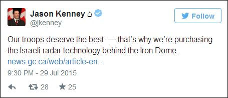 • The Canadian military is purchasing Iron Dome radar technology. According to Vice News, the system will likely be deployed in the Arctic, to counter increasing Russian activity, adding that Ottawa doesn’t expect the harsh weather to pose problems for the system. Defense Minister Jason Kenney posted this enthusiastic tweet.