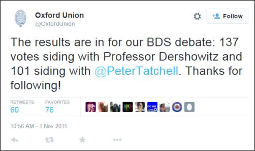 • Nice to see a semblance of sanity prevailing as Alan Dershowitz won an Oxford Union debate on BDS.