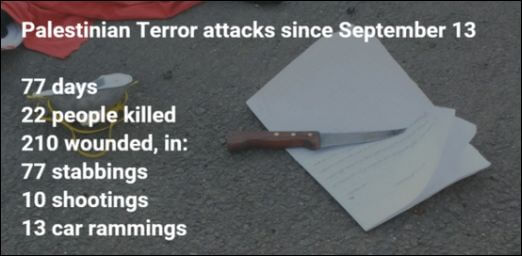 • A woman was stabbed at a bus stop in Jerusalem this morning. The victim, a 31-year-old foreign worker from Nepal, described the attack to YNet. Also this morning, a police officer was injured in a stabbing attack at the Damascus Gate of Jerusalem’s Old City. On Saturday morning, a Palestinian woman and her friend were arrested after trying to stab soldiers at a Jordan Valley checkpoint. And on Friday, eight soldiers were injured in two separate Palestinian car-ramming attacks in the West Bank.