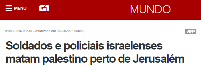 O G1 publicou no dia 1º de março uma notícia cuja manchete anunciava “Soldados e policiais israelenses matam palestino perto de Jerusalém”. Com informações da Agência de Notícias Francesa (AFP), a notícia não mediu esforços para chamar maior atenção do público a um lado da história: o da agressão por parte das Forças de Segurança de Israel contra palestinos.