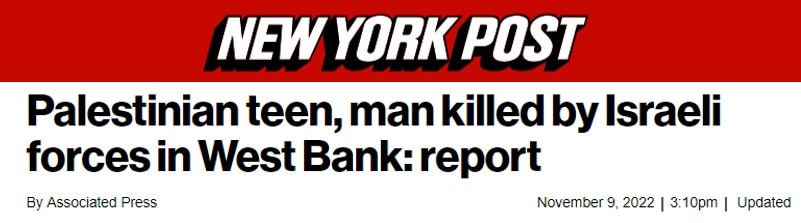 The Associated Press, however, ran its initial story under the headline “Palestinian teen, man killed by Israeli forces in West Bank” before updating to the more neutral “Palestinians say 2 killed by Israeli forces in West Bank.”