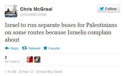 • A strange tweet from The Guardian’s Chris McGreal raises the specter of apartheid. Incomplete sentences are forgivable — I’ve also prematurely pressed the tweet button on occasion. But in the absence of any related tweets from McGreal’s Twitter feed (at least as of now) what is this tweet talking about, and where’s the proof?