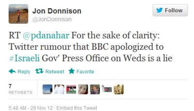 • Yesterday, BBC reporter Jon Donnison was summoned to a hearing at the Government Press Office regarding a photo of he retweeted (injured Syrian children presented as Palestinian). HonestReporting has learned that the GPO gave Donnison a warning and that was it.