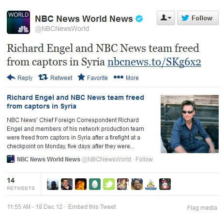 2. NBC News announced that its news crew in Syria, including chief foreign correspondent, Richard Engel, were released from captivity. So far, the abductors remain unknown.