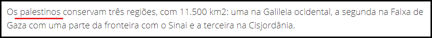 Por esse mesmo motivo é errado falar em “Estado palestino” no contexto da partilha. O correto é “Estado árabe”, que foi o real termo usado na proposta da ONU. “Dossiê palestino” deveria aparecer como “Dossiê da Palestina”.