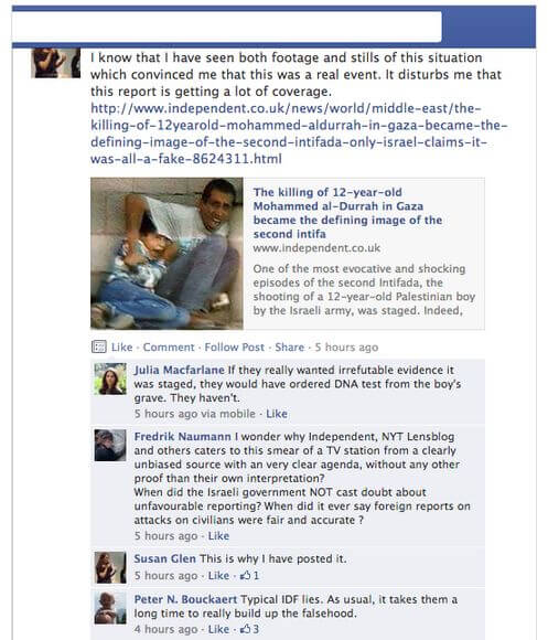Following the release of the Israeli government report on Mohammed al-Dura, the Washington Free Beacon reports on a closed Facebook group where journalists and so-called “human rights” officials created an online anti-Israel hate-fest: