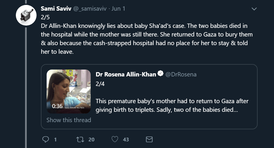 Allin-Khan’s op-ed, published on June 8, was pre-dated by a string of tweets on May 31 in which she wrote, “two of the babies died in hospital – their parents were told over the phone.” Within hours, multiple Twitter users responded with comments and links showing that Israel’s Coordinator of Government Activities in the Territories (COGAT) unit stridently refuted the story.