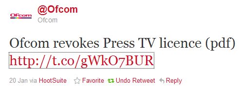 • Good news: Ofcom (pdf) revoked Press TV’s license to broadcast in the UK. What did in Press TV? Their broadcasting license was held in the UK, but editorial control was in Tehran, which breached Ofcom regulations. The Guardian summarizes: