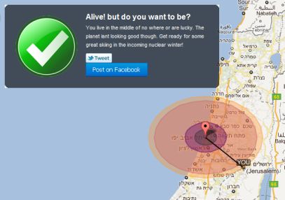 • I checked out Would I Survive A Nuke (via Gizmodo). You enter your location and choose size of closest population centers and bombs and hit enter. What if a 50 megaton A-bomb hits Tel Aviv?