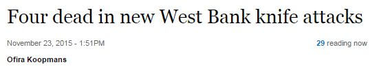 On Sunday, three Palestinian terrorists attempted to stab Israelis in unrelated attacks, killing one woman. The terrorists were killed in self-defense. The New York Times initial headline (since changed): 1 Israeli and 3 Palestinians Killed in Attacks in West Bank.