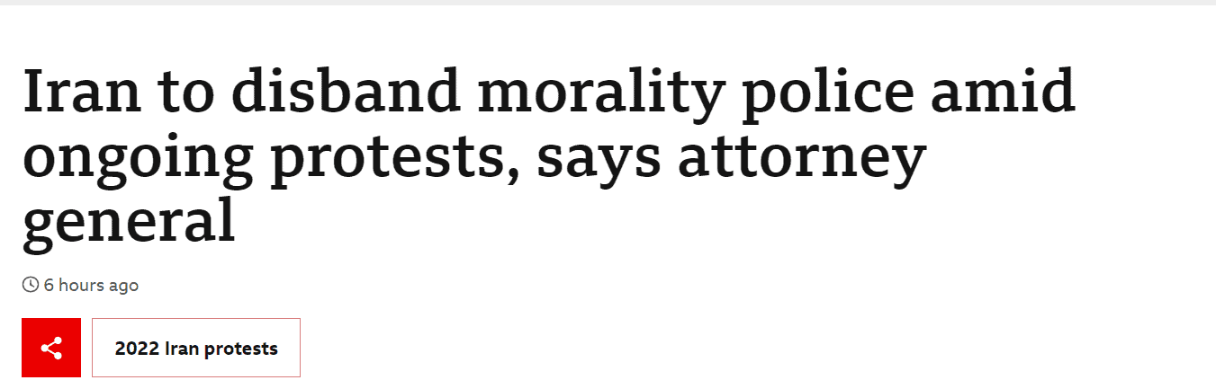 Soon after Montazeri made his statement, major media outlets were quick to title their reports with such headlines as “Protest-hit Iran abolishes morality police,” “Iran Disbands Morality Police, Considers Changing Hijab Laws, Official Says” and “Iran to Disband Morality Police Among Ongoing Protests, Says Attorney General.”