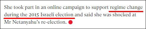 “She took part in an online campaign to support a change of government during the 2015 Israeli election and said she was shocked at Mr Netanyahu’s re-election.”