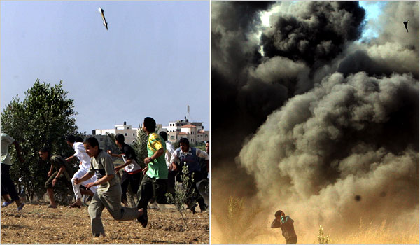 “Some 14 rockets fired by Hamas militants in Gaza on Thursday landed in Israel, 6 of them near Sderot, a border town, the Israeli Army said. The government bused some Sderot residents to hotels in what it called a respite, not an evacuation.”