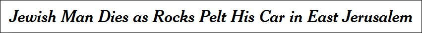 The Jewish man did not simply “die” and rocks did not “pelt his car” of their own accord. Palestinian attackers were responsible for hurling those rocks at the car. Perhaps the New York Times might wish to consider the comments of Mr. Levlovitz’s son: