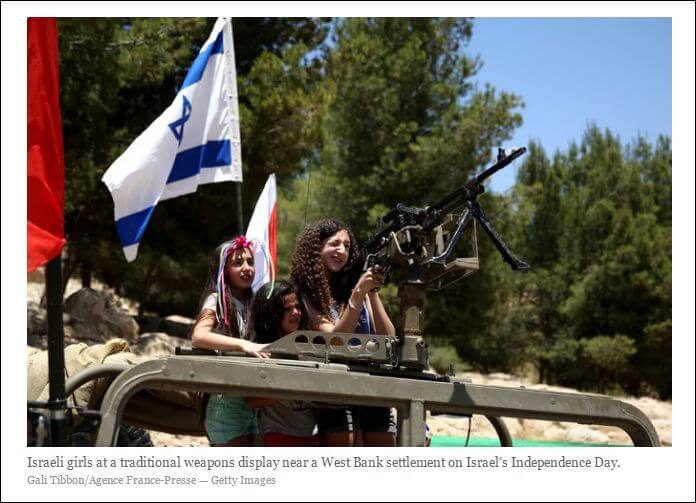 While the photo may show Israeli girls handling a machine gun, you can guarantee that the weapon is not loaded and these girls are not receiving actual military training. Contrast this with Hamas and Islamic Jihad “summer camps” where Palestinian children actually undergo military training with the intent to murder Israelis. There is no moral equivalence between this and Israelis visiting military bases on Independence Day.
