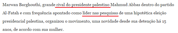 E o caso se repete nos veículos brasileiros que não só citaram as declarações de Barghouti diversas vezes para explicar a greve de fome, como também se abstiveram de prover o histórico do terrorista aos leitores. Ao invés de explicar quem ele é, e por que ele está atrás das grades, Barghouti é apresentado apenas como um líder, inclusive cotado pela população palestina para ser o próximo presidente, ou seja, uma personalidade louvável de certa forma.