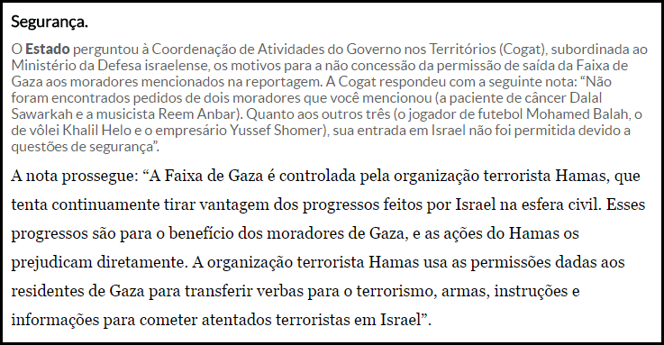 Certamente, é justo que um jornalista explore a experiência subjetiva de um entrevistado palestino. É também justo investigar o peso real que as barreiras entre Gaza e Israel criam na vida diária palestina.