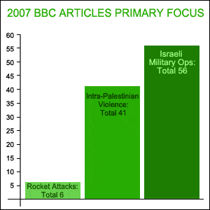 - In 2007, the BBC showed a greater interest in covering attacks in which Palestinians were the victims than in attacks targeting Israelis. The fact that only six articles were published about specific rocket terror attacks, despite the fact that the number of attacks increased dramatically in 2007, is a glaring omission.