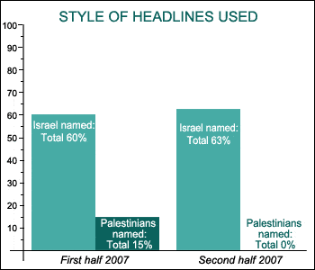Six months ago we asked if the BBC’s style was consistent. We found that it was not. During the first half of 2007, 60% of articles about Israeli operations named Israel or the IDF directly as the perpetrator while only 15% of stories about Palestinian violence named the perpetrators.