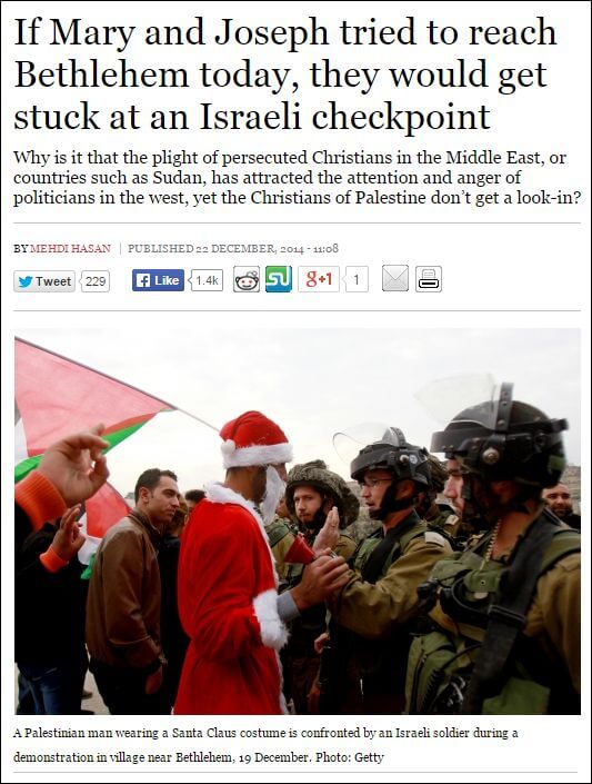 It just wouldn’t be the holiday season without some media outlet running the same tired old anti-Israel story with a Christmas theme complete with a Palestinian Santa Claus. This year it’s Mehdi Hasan in the New Statesman (cross-posted in the Huffington Post UK) who wins the prize for the least original piece of Christmas bias.