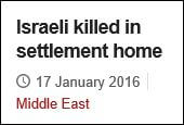 The BBC‘s coverage included virtually no prominent details about the murder itself save for identifying Dafna Meir as a mother in her late 30s. Instead, the choice of headlines demonstrates the BBC’s priorities – the fact that Dafna Meir happened to live in a settlement: