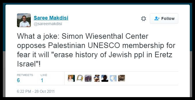 Interestingly, in 2011, Makdisi mocked the Simon Wiesenthal Center’s concern that Palestinian UNESCO membership would erase the history of the Jewish people in Israel. Today UNESCO approved a resolution put forward by the Palestinians that denies Jewish and Christian connections to Jerusalem and the Temple Mount, after the UN organization approved a similar one just a week ago.