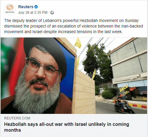 Please note the missing ‘terrorist’ in this Reuters Facebook post. This isn’t merely an oversight. The complete article doesn’t include the term ‘terrorist’ or ‘militant.’ Omitting this basic fact about Hezbollah denies news readers access to crucial information about its history, modus operandi, and connection to one of the world’s leading state sponsors of terrorism.