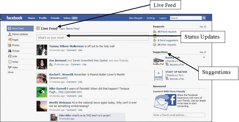 Once you become someone’s friend on Facebook, their “status updates” and activities will appear on your “Live Stream” and your updates will appear on theirs. Here is a picture of what you might see when you login to Facebook: