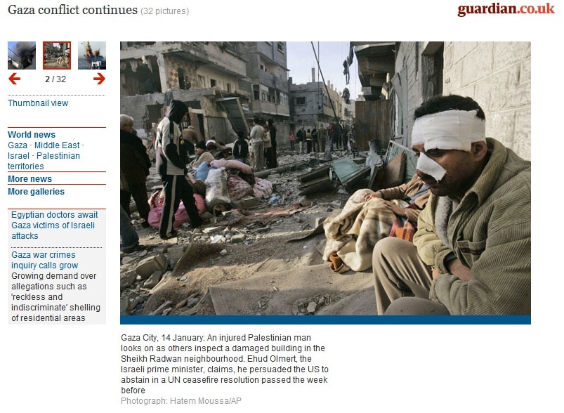 We weren’t convinced. Unable to locate this AP photo in searches of recent images from the wire services in Gaza, we dug a little deeper until we found the very same photo with its original caption taken on 14 January 2009 during Operation Cast Lead (seen here as part of a Guardian photo slideshow).