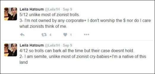 The Israellycool blog took a further look back at Hatoum’s Twitter feed and found some more blatantly anti-Semitic tweets that made it crystal clear that Leila Hatoum has a problem with Jews: